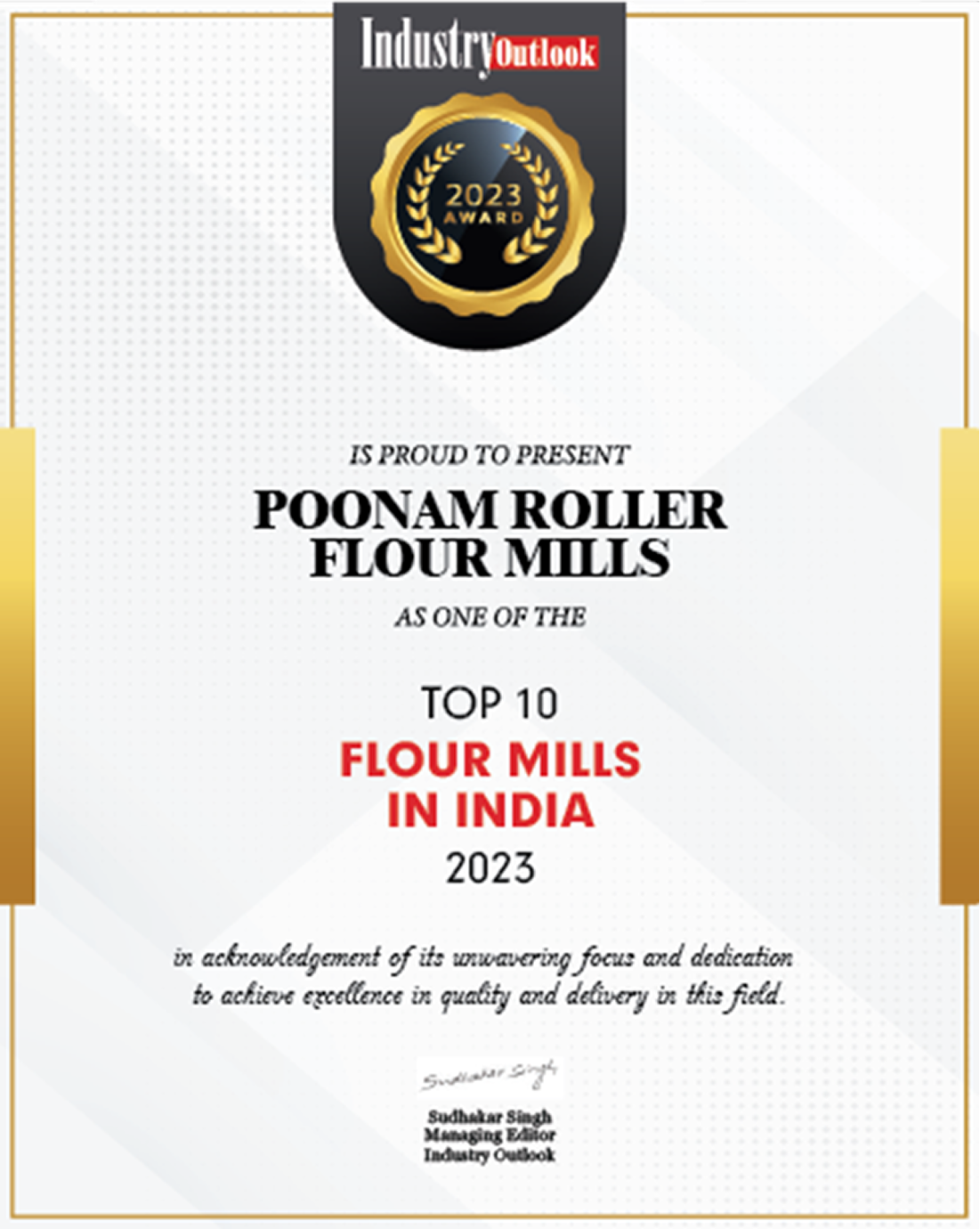 Poonam Roller Flour Mills proudly received the Industry Outlook 2023 Award, securing its place among the Top 10 Flour Mills in India. This recognition highlights the company’s unwavering commitment to quality, consistency, and innovation in the flour milling industry.