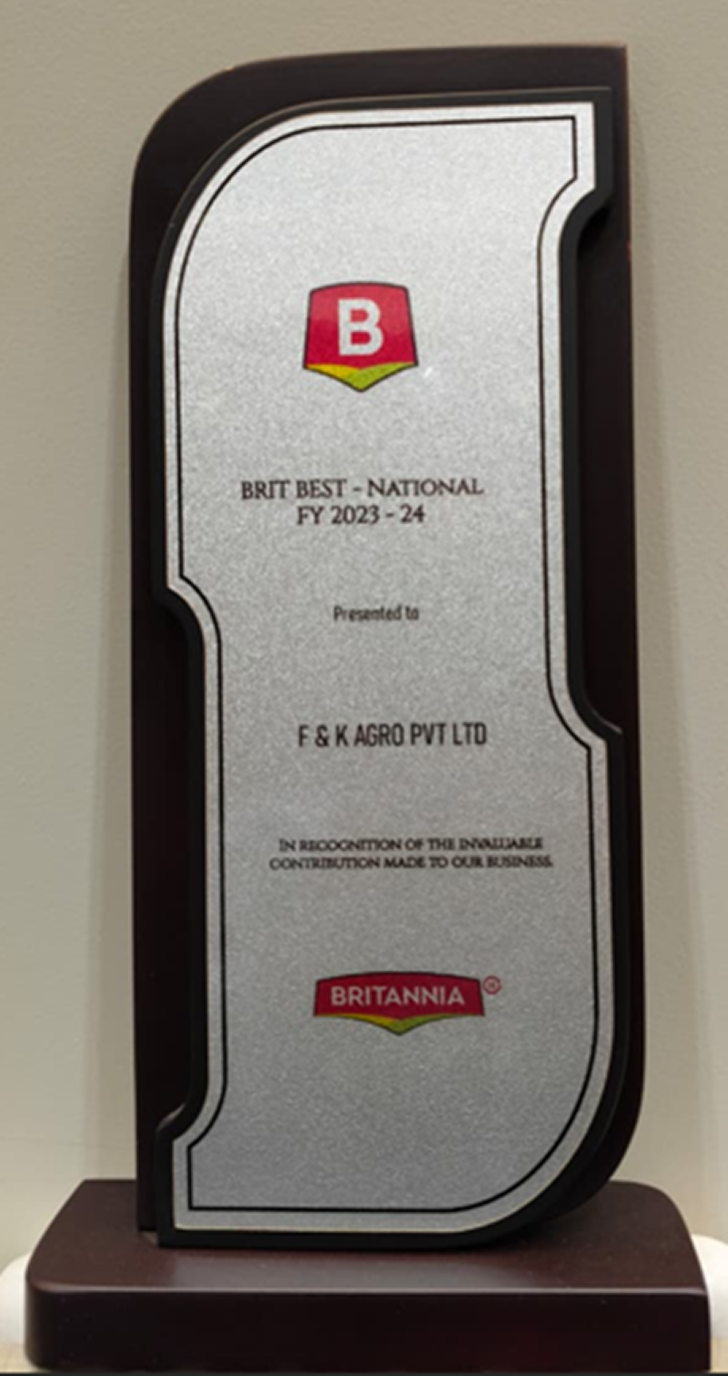 F & K Agro Pvt Ltd has once again been recognized for its exceptional performance and dedication, this time on a national stage. Britannia Industries Ltd presented the company with the BRIT Best – National Award for FY 2023–24, a prestigious honor that celebrates partners who demonstrate outstanding contribution, reliability, and excellence in driving business growth.