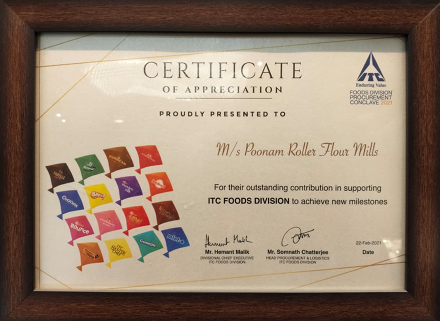 Poonam Roller Flour Mills was honored with a Certificate of Appreciation by the ITC Foods Division, recognizing the company’s outstanding contribution and support in helping the division achieve new milestones.